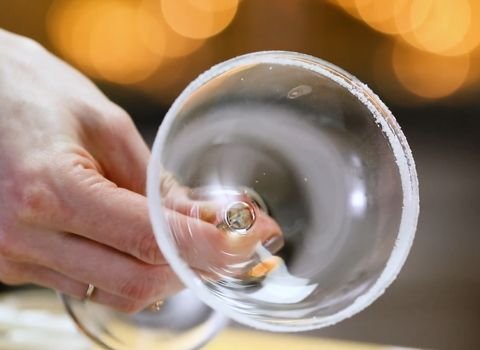 - Use your strainer to pour the liquid from the shaker into your prepared sugar-rimmed glass. The strainer will catch all the ice.