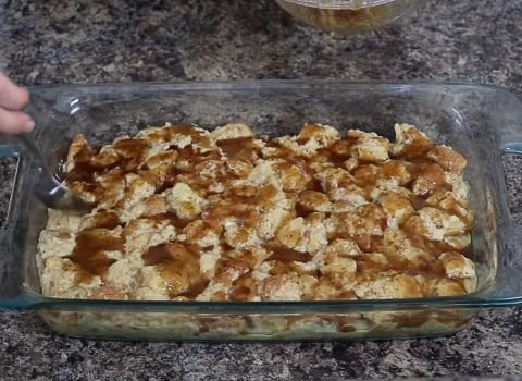 - Remove the cover from the baking dish and drizzle the brown sugar cinnamon mixture evenly over the top of the casserole. Make sure the entire surface is covered to create a golden, crispy crust.