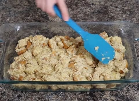 - Pour the custard over the bread cubes in the baking dish. Use a rubber spatula to gently fold the bread so every piece gets coated. Be gentle to avoid breaking the bread. Press down lightly so the bread sits in an even layer and some custard is visible between the pieces.