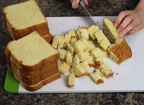 Spray the 9×13-inch baking dish with non-stick cooking spray. Take your loaf of brioche or French bread and use a sharp knife to cut it into 1-inch cubes.