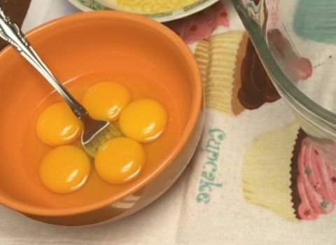 - Carefully separate 4 eggs. Place the yolks in a small bowl and the whites in a clean, dry, grease-free mixing bowl. Set both aside. Even a little yolk in the whites can stop the meringue from whipping properly.