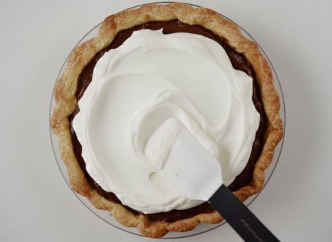 - Spoon the meringue over the warm chocolate filling, starting at the edges and working toward the center. Make sure the meringue touches the crust all the way around to seal it.