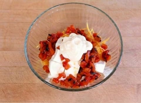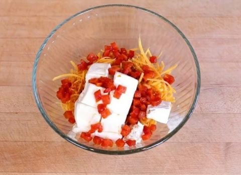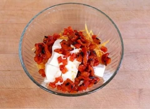 - Gently mix all ingredients using a large spoon or clean hands. Toss until the cream cheese is fully blended and the mixture looks evenly combined with visible red pepper pieces.