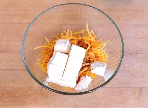 - Let the eight-ounce block of cream cheese sit out for about three hours until fully room temperature. Add it on top of the shredded cheese but do not mix yet.