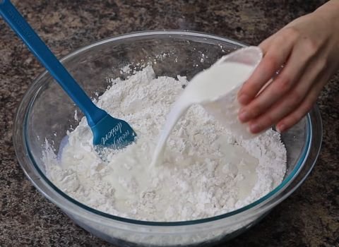 Drop in about two spoonfuls of shortening or lard into the flour well. Then pour about 1 cup of buttermilk into the center well over the shortening. The liquid should cover the fat.