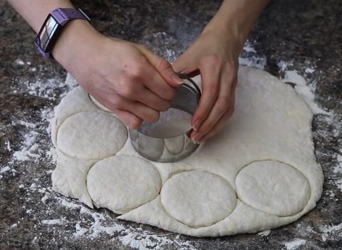 10. Press a biscuit cutter or round can straight down into the dough without twisting. Remove the cut biscuits and place them on the greased pan, touching each other slightly to encourage rising. Gather leftover dough gently, pat it together, and cut additional biscuits. Don’t overwork the scraps - they may be slightly less perfect but still tasty.