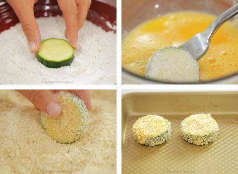 3. Pat the zucchini slices dry with paper towels. Dip each slice in the flour first and shake off the extra. Next, dip it in the egg and let the extra drip off. Then coat it well in panko bread crumbs. Place each coated slice on a tray.