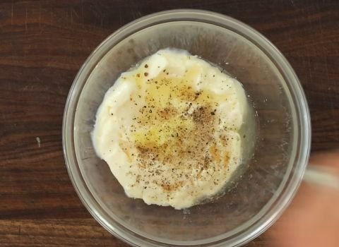 6. In a small bowl, mix mayonnaise, garlic, lemon juice, salt, and black pepper. Stir until smooth and creamy.