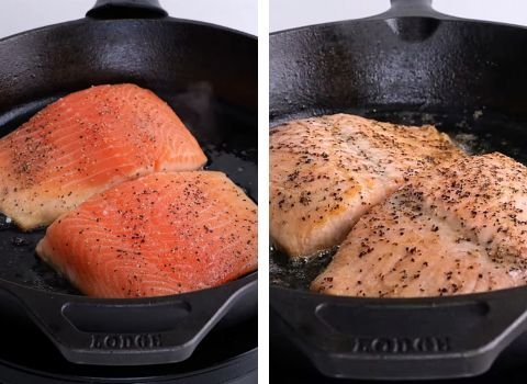 Carefully place the salmon fillets in the hot skillet, skin-side down if applicable. Do not move them. Cook for 4 – 5 minutes until the first side develops a golden crust.
