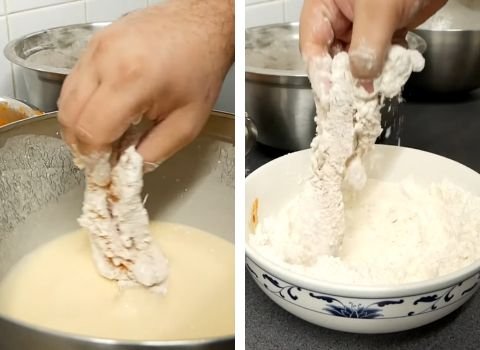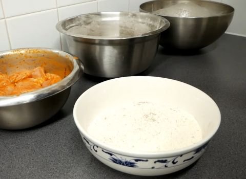 - Arrange three bowls: one with plain flour, one with the wet batter, and one with the seasoned dredge. Keep a clean plate nearby for the coated chicken.