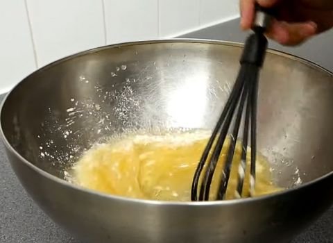 - Crack eggs into another bowl, add salt, and whisk until smooth. Slowly pour in soda water while whisking to create bubbles for a lighter coating. Gradually whisk in flour to prevent lumps. The batter should be smooth, thick enough to coat a spoon, but still flow easily.