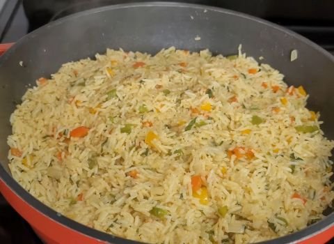 Seasoned rice is regular rice cooked with herbs, spices, and vegetables. It has more flavor than plain white rice. Garlic, onions, and peppers are added while cooking. These ingredients make the rice colorful and tasty.