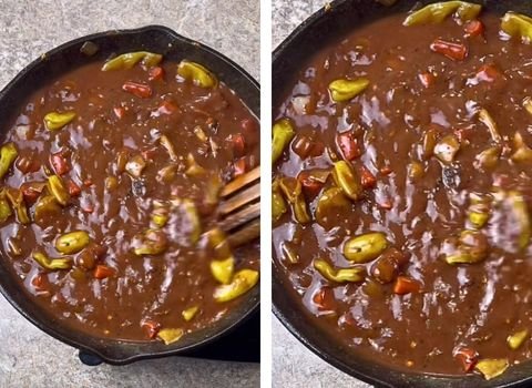 3. Next, pour the jar of peperoncini peppers with the juice into the skillet. Add the beef stew seasoning packet, au jus gravy mix, and ranch seasoning packet. Then pour in the tomato sauce. Fill the tomato sauce can halfway with water and add that as well. Stir everything together until it’s well mixed.