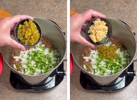 2. While the sausage is cooking with the beef, add the six ounces of tomato paste. Stir it in really well. Next, add your chopped large onion, the two chopped jalapeños, and the four ounces of Hatch green chilies. Stir everything together and let it cook for about five minutes. Now, add the two tablespoons of freshly minced garlic and the three ounces of Williams chili seasoning. Stir for one more minute until it smells amazing.