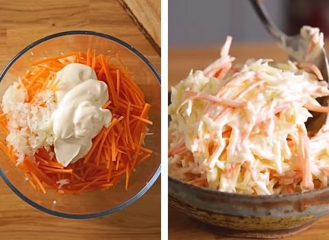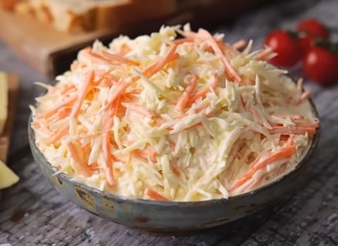 This version became well known for its soft blend of crunchy cabbage, sweet carrot, and mild onion mixed with a creamy dressing that feels balanced and calm.