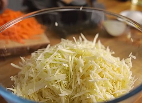 Remove the outer leaves from the cabbage. Place the cabbage on the board. Slice it into thin strips by using a mandolin, or use a knife to form long, narrow pieces. Keep the strips as even as possible. Place the shredded cabbage in a large bowl.