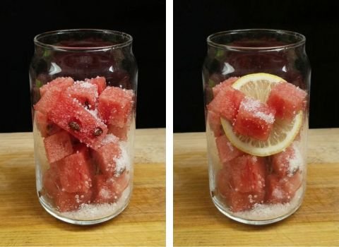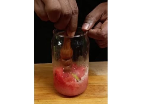 - Use a muddler or a wooden spoon to gently crush everything together. Lightly press to release the juice from the lemon and soften the watermelon.