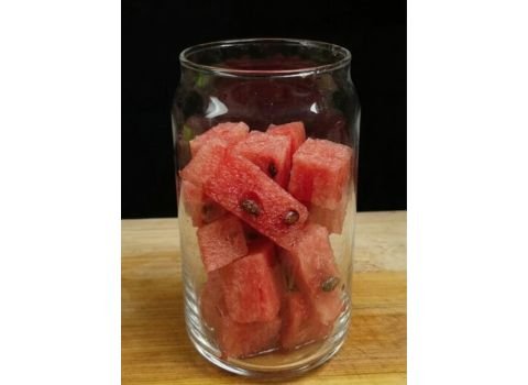- Take a large drinking glass and add your watermelon cubes to the bottom. Fill about one-third of the glass with watermelon.