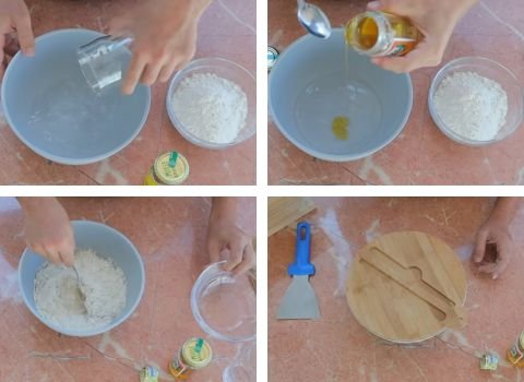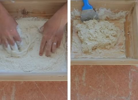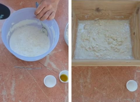- Add all the flour to the bowl at once. Mix with a wooden spoon first. When it starts to come together, switch to your hands. Knead gently inside the bowl until no dry flour is visible. The dough will feel sticky and rough. This is normal.