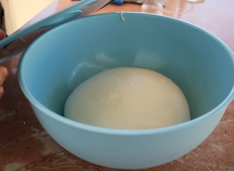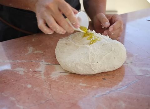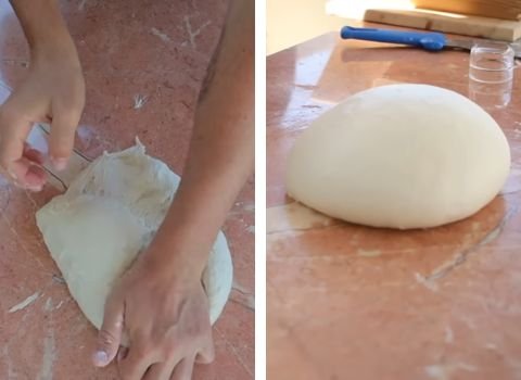 Lightly oil your hands with olive oil. Pick up the dough and pull the edges underneath while rotating it.
